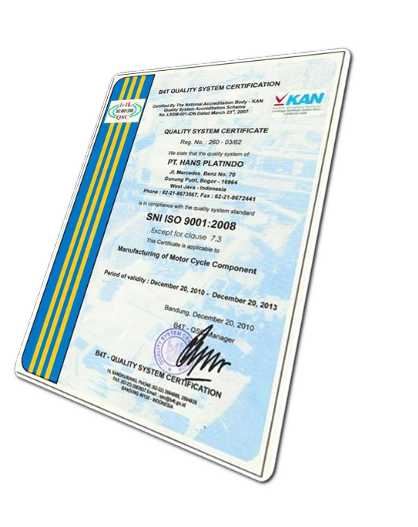 Iso Certificate Since the year 2010, PT. Hansplatindo has implemented quality management system ISO 9001: 2008 – ISO 9001:2015 Certification Agency (B4T) Bandung.